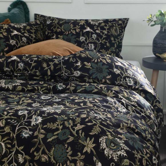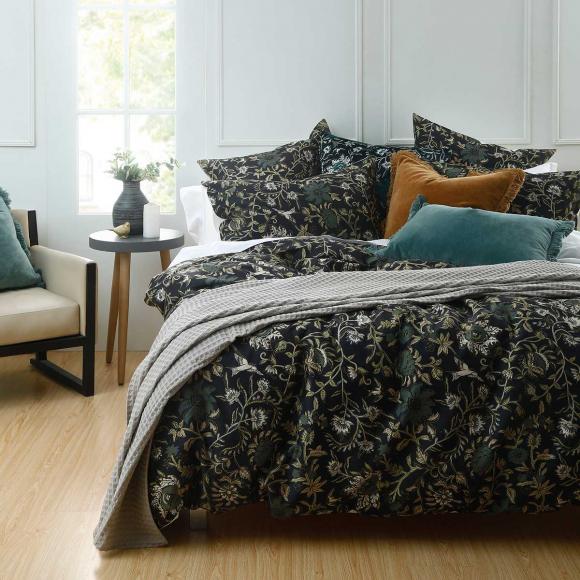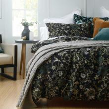 The timeless and luxurious style of the MM Linen Ivy Duvet Set features a repeat pattern of burnished golden vines, leaves and birds upon a smoky deep blue background.