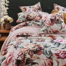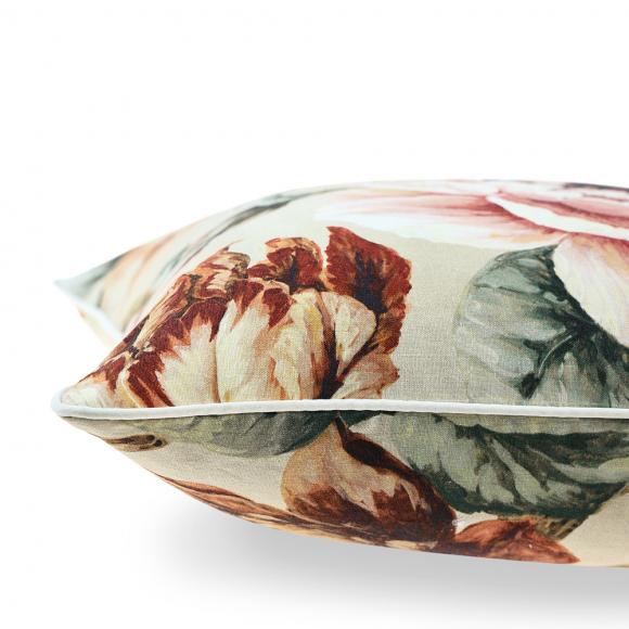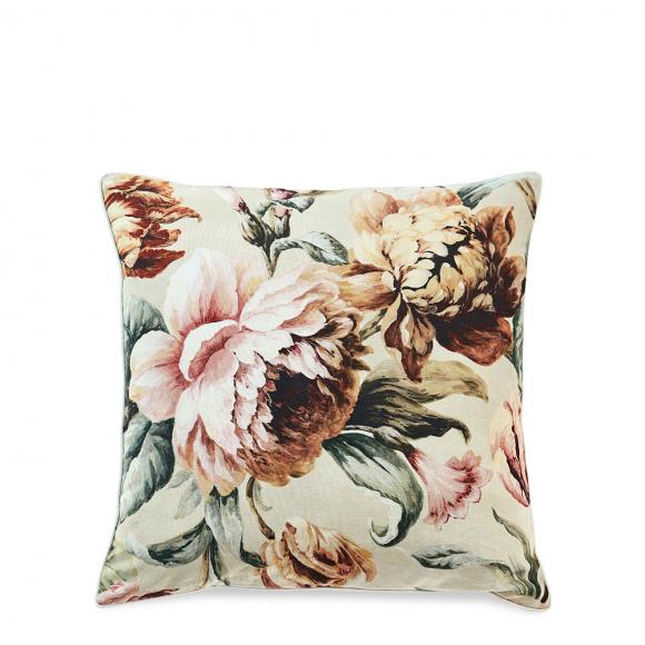 The Maxima cushion is covered in florals of soft pinks upon the softest sage green coloured background.