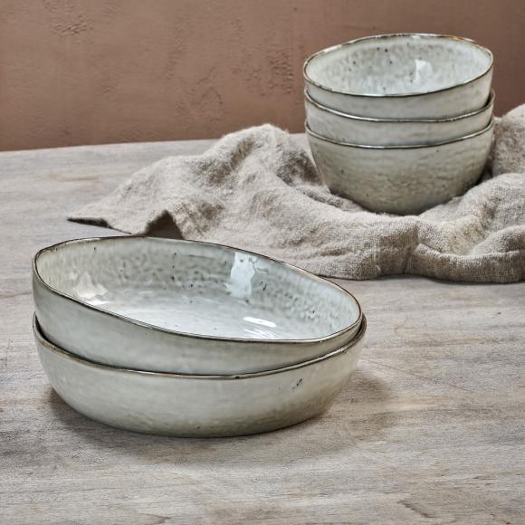 Natural, and serene these Amina bowls are perfect for morning cereal, or delicious puddings. The deep bowl shape complements the appealing off - white glaze and subtle mottled finish. The rim of the bowl has a darker earth toned finish that adds definition.