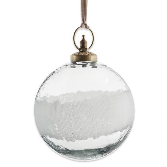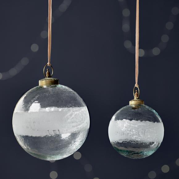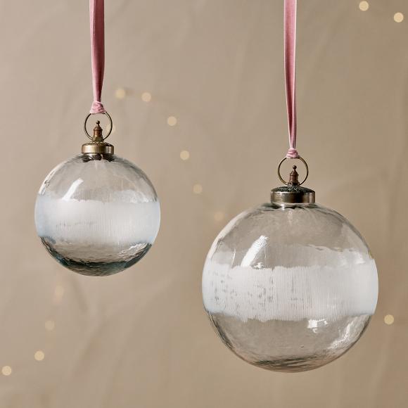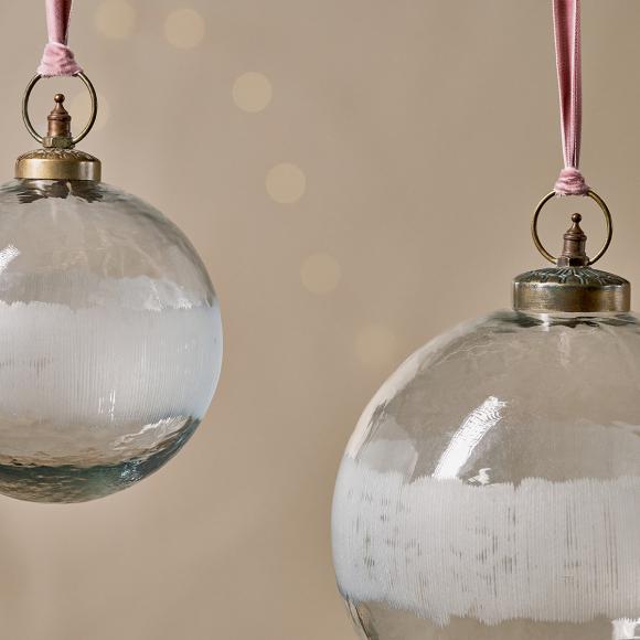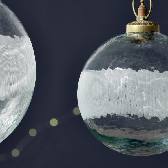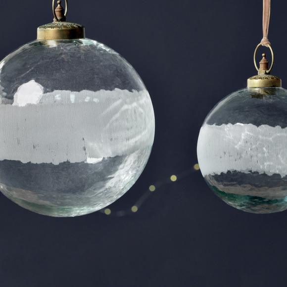 Anara round baubles are crafted with recycled hand blown glass, a traditional method giving each piece a bit of individualism. Decorated with a striking frosted design, which is completely hand-etched.