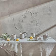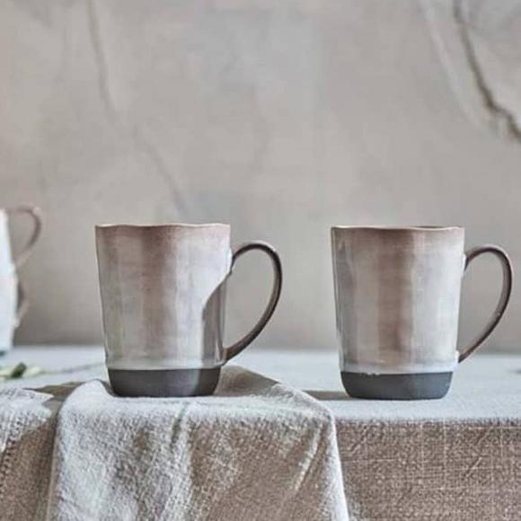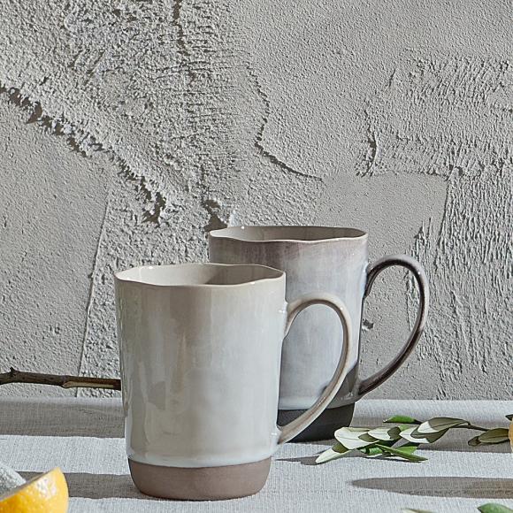The tactile, rustic quality of these tall Edo mugs is created by an earthy palette of textures in subdued slate and an of off -white glaze.