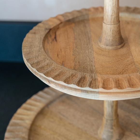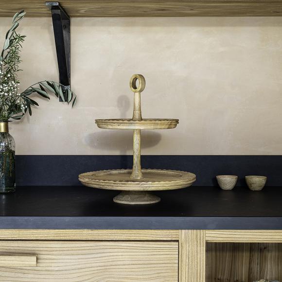The Gavivi collection also features a magnificent mango wood, tiered cake stand. A paired back and natural alternative to display cakes, pastries or even sandwiches. Gavin offers stunning artisanal details, with its hand carved decorative edge, two raised platters and a simple circular handle. It is packed with rustic charm. Mango wood is a sustainable wood that has a striking natural grain and variated colour tone. Wood is a tactile material that works well in a kitchen or dining room due to it's versatile properties.