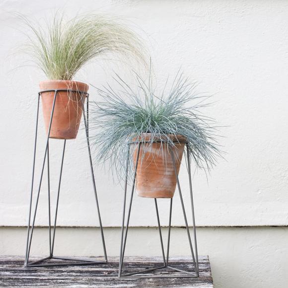 The iron frame of these stylish Jara planters has a striking geometric design that forms an attractive framework for the traditional terracotta pot. These standalone plant holders come in two sizes and display well together providing a variety of heights for an indoor garden space.