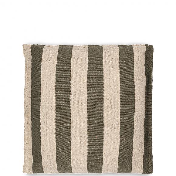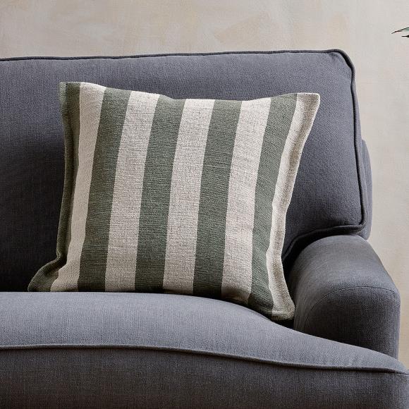Kobbari is a cushion cover with vibrant moss green stripes. Perfect for adding a pop of colour and wholesome texture to any living space. Can be utilised as an indoor scatter cushion, or used for outdoor seating or dining decoration. The combination of durable cotton and tactile jute creates a material with unique and characterful detail. Each cushion is made on a hand loom by skilled artisans, adding a genuine touch of masterful craftsmanship into your home. This cushion cover is also available in rust.