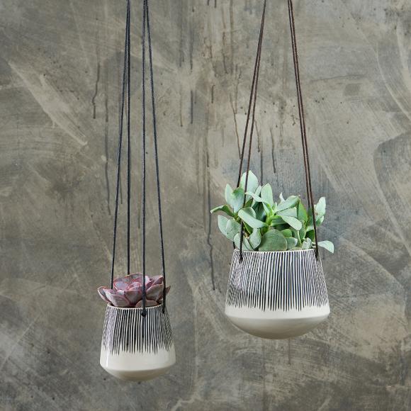 These stylish hanging planters have an attractive black etched design. The tapered shape is ideal for displaying indoor plants, succulents and cacti. These curved planters have a strong cotton tie, adjust as required.