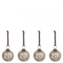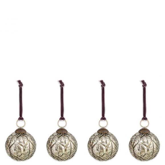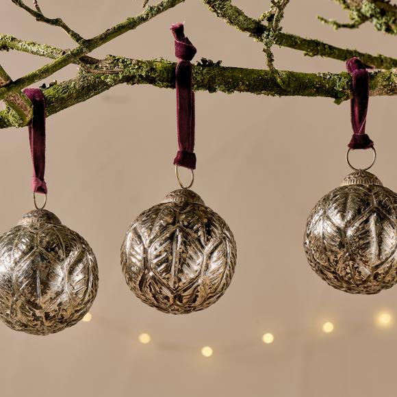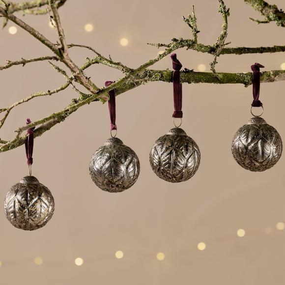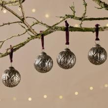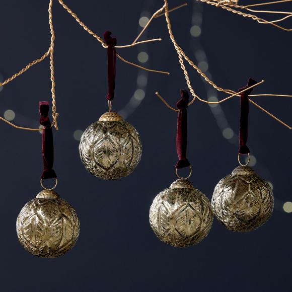Add a touch of vintage glamour to your festive decor with Nkuku's set of four recycled glass Patta Baubles featuring a timeless design and rich patina.