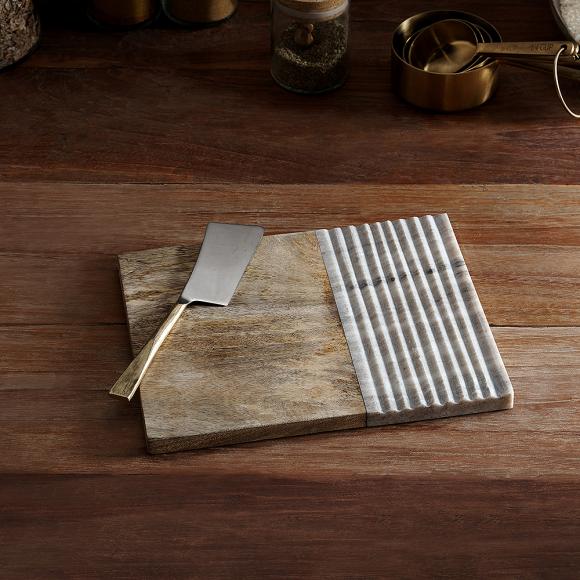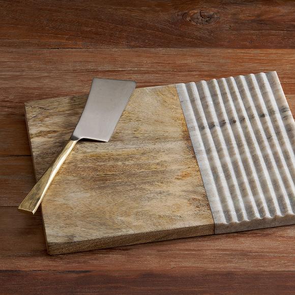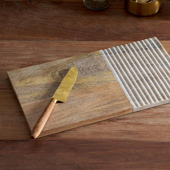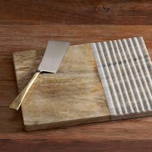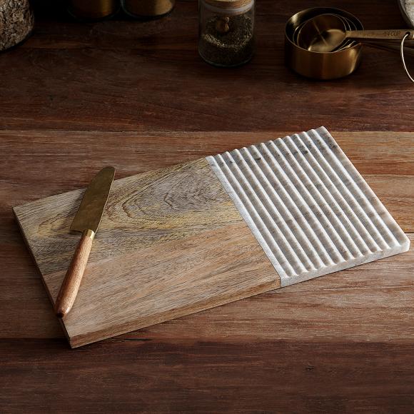 The Reyna chopping board collection celebrate simplistic design with a sophisticated finish. An ideal and versatile piece of serve ware, can also be used for chopping and serving. The beautifully textured marble is hand-grooved with muted hues that complements the warmth of the grain of the mango wood.