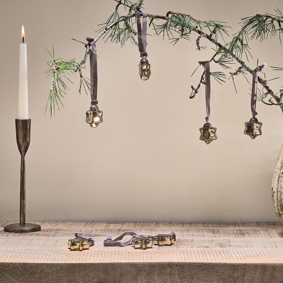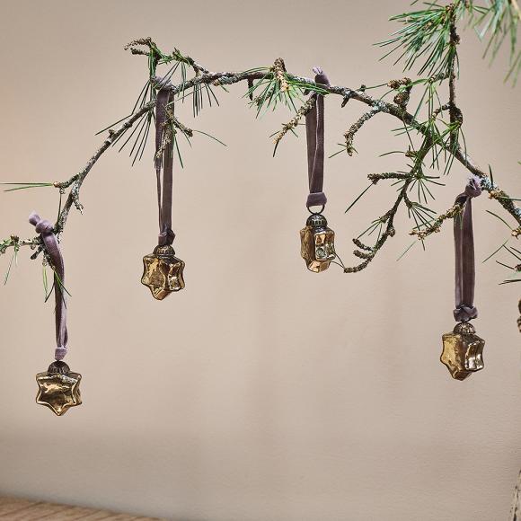 The Sardi baubles are a delicate and perfect adornment for your festive season. Can be hung on traditional Christmas trees, or bare foliage branches for a striking yet minimal display. Inspired by Nkuku set of 12 smaller Sardi stars, this collection is available in a set of 4. Finished with an antique-style clasp and tasteful velvet ribbon. The Sardi baubles are available in a clear glass, or antique gold finish.