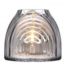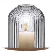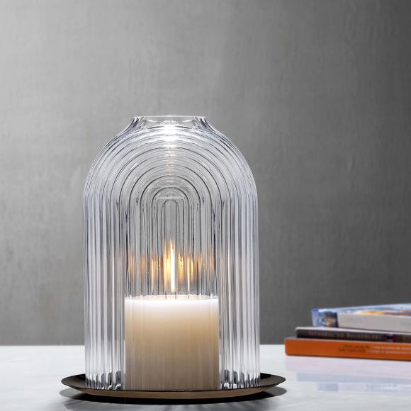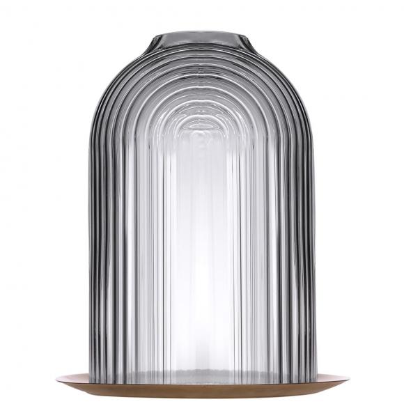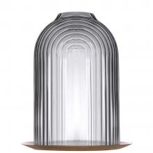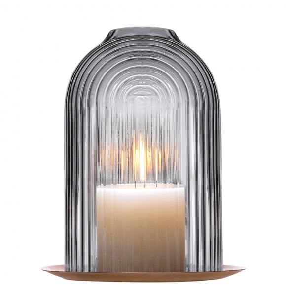 Perfect for indoor and outdoor displays, this medium NUDE Ilo candle holder comprises a clear crystalline dome, enriched with a hand-engraved ripple pattern, resting atop a light-reflective copper base. It can be used alone or combined with other pieces from the range for a captivating effect.