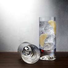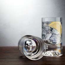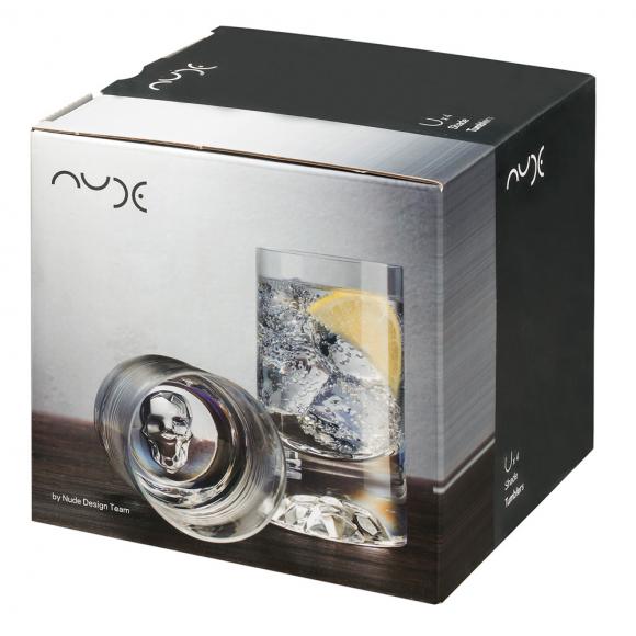 This NUDE Shade set of low ball glasses possess all the defining features of the series: a modern, minimalist shape and a traditional heavy base etched with a sculptural skull motif.