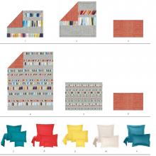 The back reiterates the canvas effect with a chambray-style red vertical stripe. Jacquard terrycloth with alternating strips of coloured velvet and grey moss stitch-effect strips.