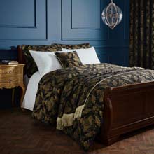 Accessories available include pencil pleated curtains with tie backs, pillow shams, cushion covers, a table runner, a bullion fringed throw and a bedspread