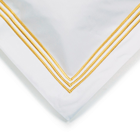 With three splendid rows of wider satin cording, 400TC bed linen is the top of the line. It is made from the finest 100% combed Egyptian cotton super percale with 400 threads per square inch. The satin cording can be supplied white, cream or coloured. This quality was previously know as "Burgundy Ribbon" signifying the presentation ribbon colour that was traditionally tied around the product prior to packaging.