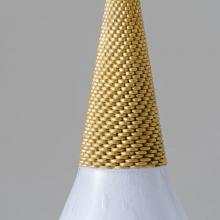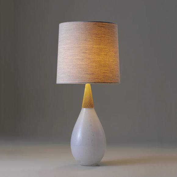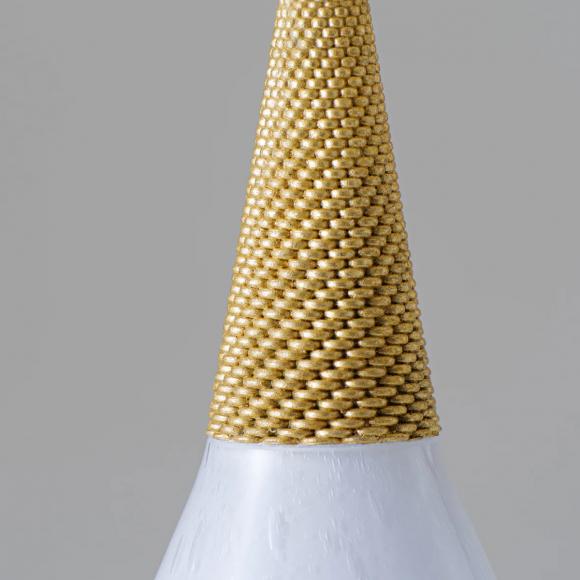 To achieve the smooth drop shape of the Pearldrop Lamp, the glass has been mould-blown. The piece is made in bubbled milk glass, creating a luxurious opaque finish and paired with a collar painted in our workshop.