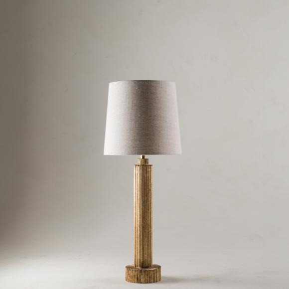 The Trevose Lamp features an architectural design, characterized by a linear column and a rounded plinth base. This free-standing piece is powered by a battery.