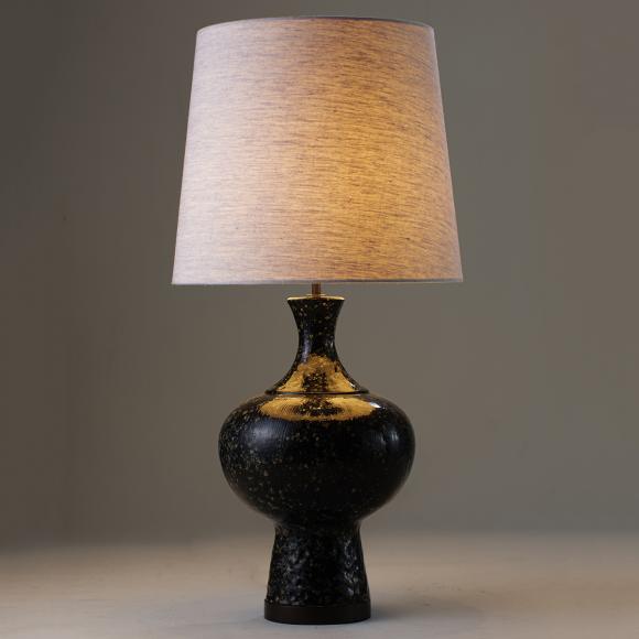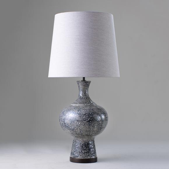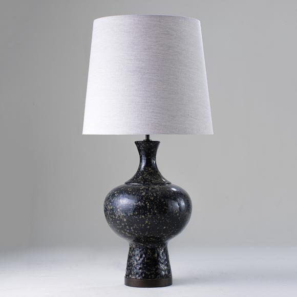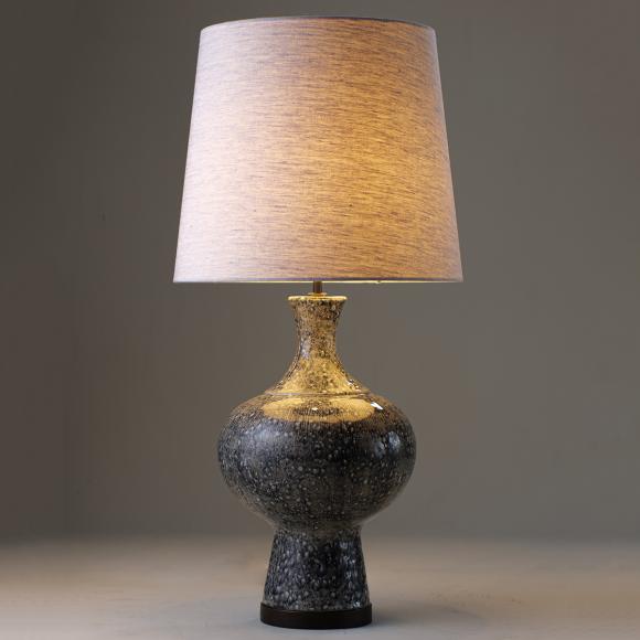 The Zulu Lamp takes its shape from that of a mid 20th century African tribal pot and is formed in cast ceramic with textures; a dappled neck and base, and fine striations on the curve of the lamp.