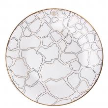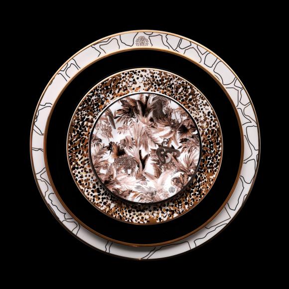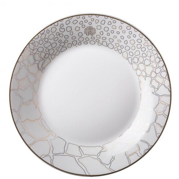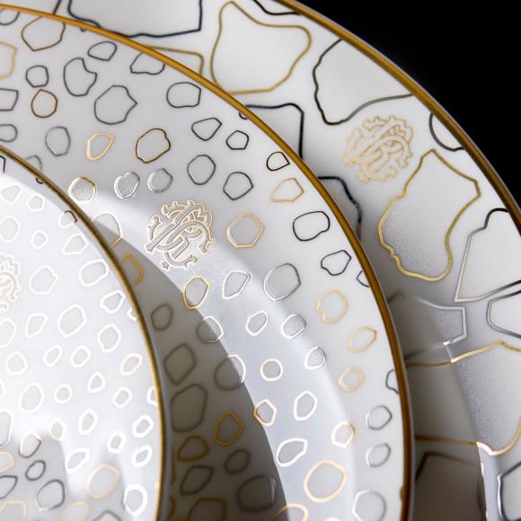 The stunning Giraffe design sits on beautiful white bone china with its gold and platinum outline design, gold rim, and delicately placed Roberto Cavalli logo.