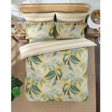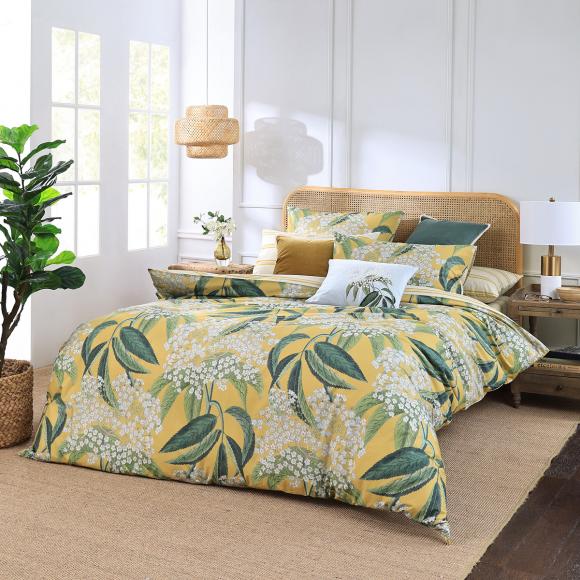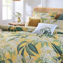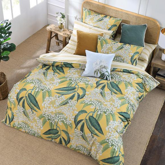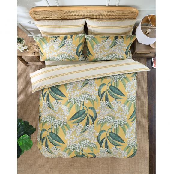 The reverse features a mustard and yellow stripe on a cream base, which also forms the basis of the fitted sheet and pillowcase set, also available.