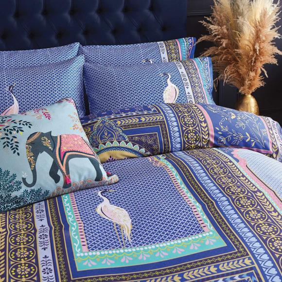 Rich and enchanting, this Sara Miller London Lattice Window Embroidered Cushion in indigo blue, features graceful storks perched among the frescoed archways and elegant latticework windows of a haveli courtyard house.