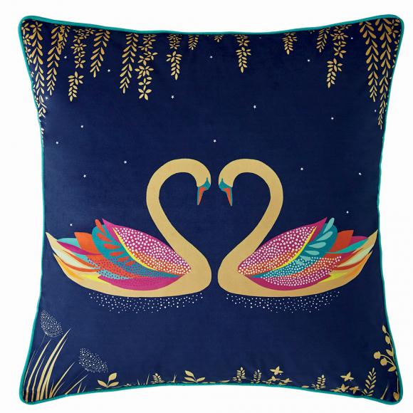 Sara Miller London Swan Cushion in Rich Navy, an enchanting design featuring vibrant swans in a magical moonlit setting.