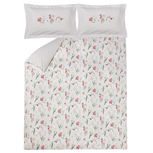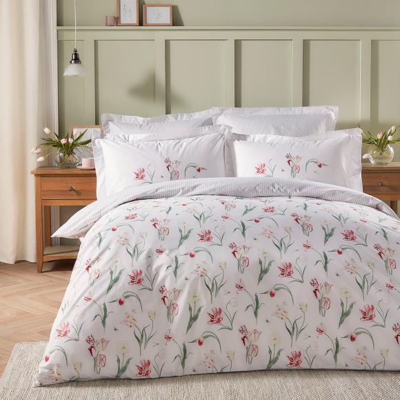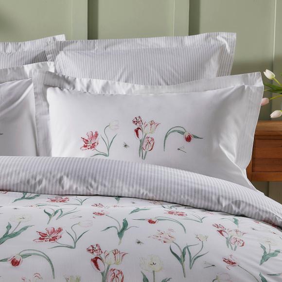 Tulip is a delicate free-hand painted design from Sophie Allport. Ready to invite Spring and Summer into your home, this duvet cover set will give your bedroom a statement style and also offer comfort and relaxation at the end of every day. Pairing perfectly with white, neutral or grey bedroom schemes. The duvet cover set features a pinstripe reverse in a soft grey, all printed on a 100% Cotton Percale and 200 Thread Count.