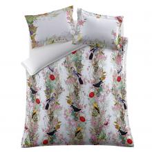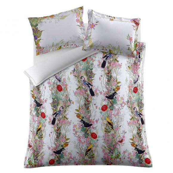 Digitally printed vibrantly coloured birds and foliage/ soft sateen ground in crisp frost colourway
