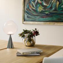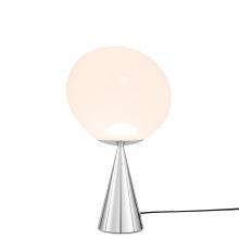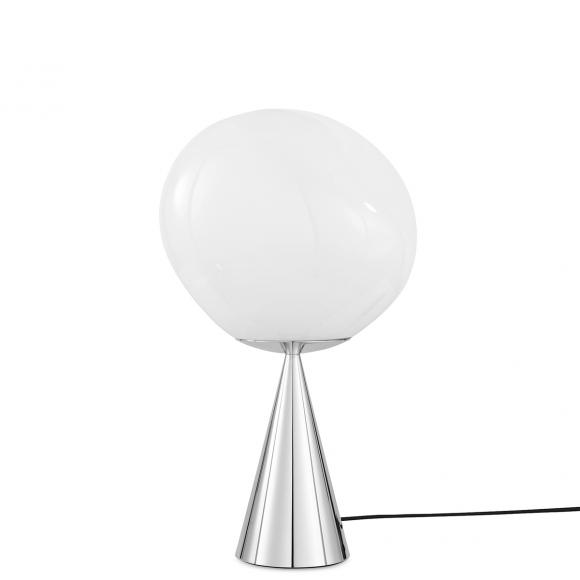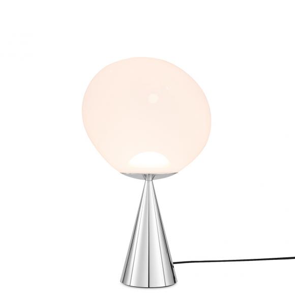 The ultimate designer table lamp, featuring the iconic Tom Dixon MELT shade sitting atop a cone-shaped sleek silver base, creating a striking silhouette.