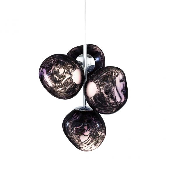 Available in six finishes, this Melt Mini chandelier consists of four orbs protruding from steel tubes, all fitted with an LED module.