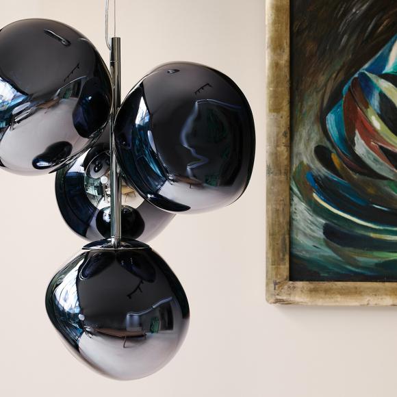 Melt is one of the most distinctive light fittings, carefully manufactured with a fabulous mirror finish, that then turns into a mesmerising hot blown glass effect when on.