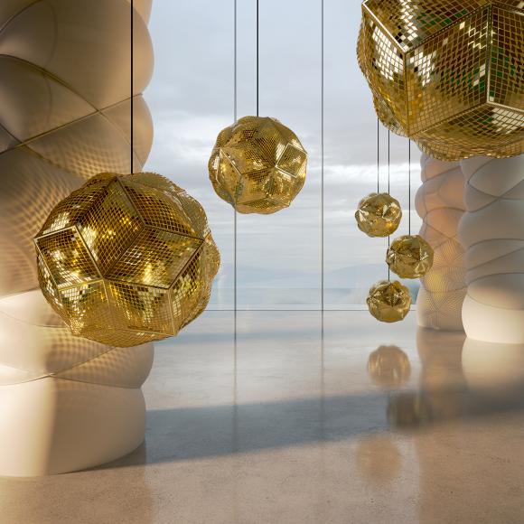 Inspired by inflatable geometry, Puff is an intricate polyhedral object made of flat diamond-shaped metal panels, expanded and ballooned as though they have been inflated thanks to their cunning incised pattern. The etched and perforated panels of Puff create small but highly reflective facets that disperse myriad internal reflections, making the inside akin to a shimmering inverted disco ball.