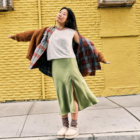 The Tazz has a 1.75" platform sole to give you a boost and is has since had an update with this new, curly sheepskin upper and UGGplush™ up cycled wool lining.