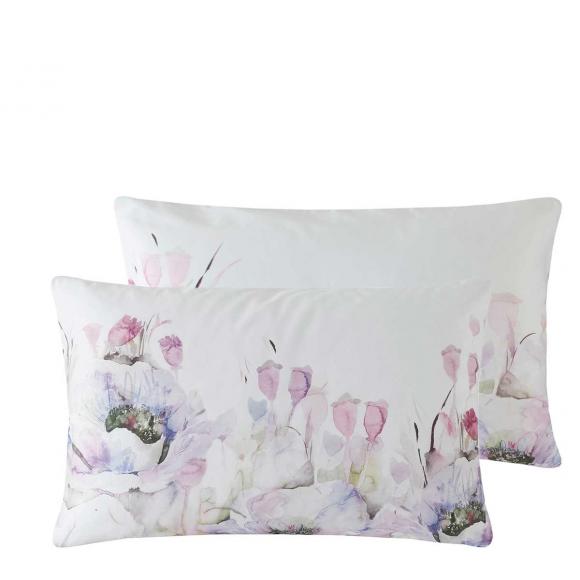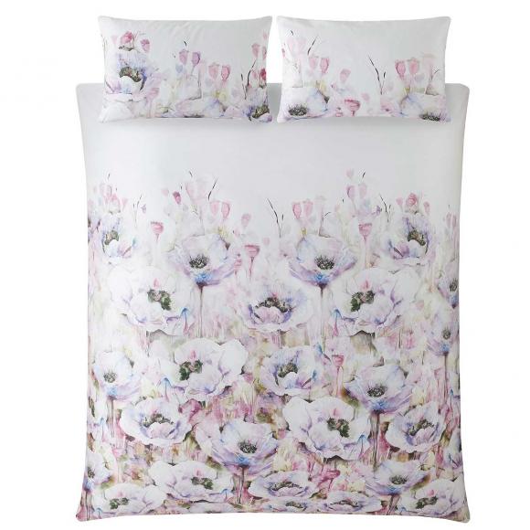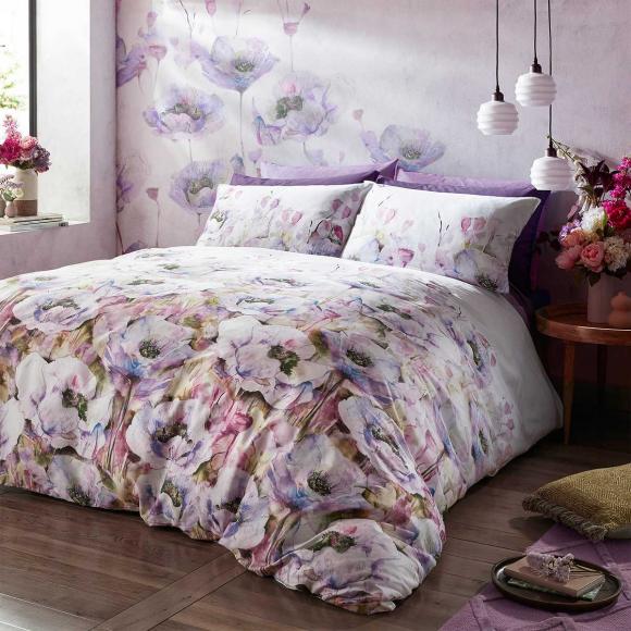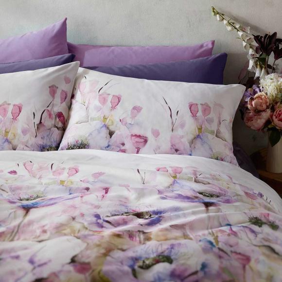 Papavera is a watercolour design of bold violet poppies printed onto a crisp white, soft cotton sateen ground.