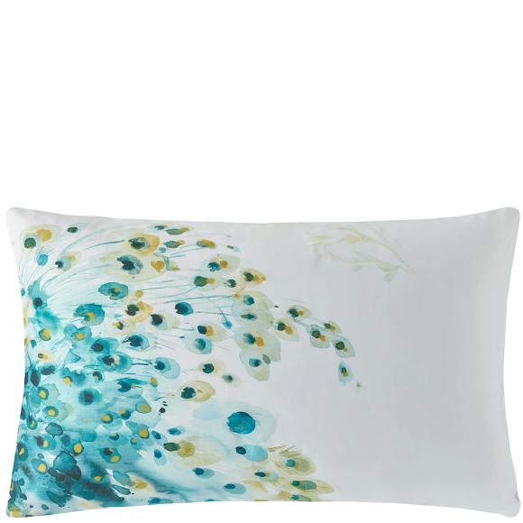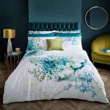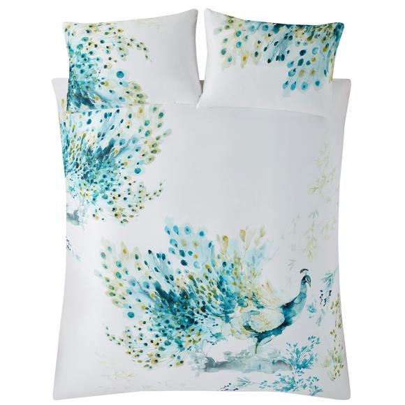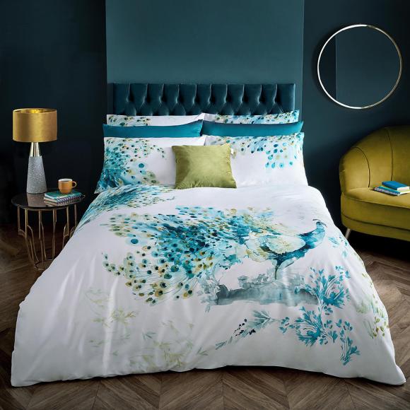 A handsome, hand painted peacock proudly adorns this stunning bedlinen.
