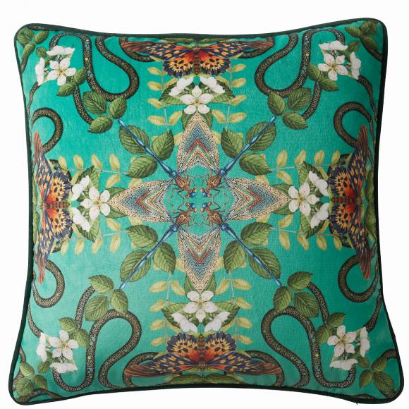 The Emerald Forest cushion is adorned with English flora and fauna.