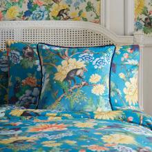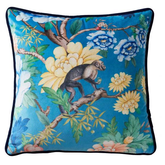 Focusing on the temple-dwelling monkey of the bedding collection, the Sapphire Garden cushion further highlights the decorative Indian designs of this archival Wedgwood print.