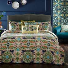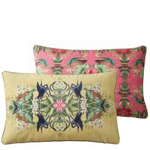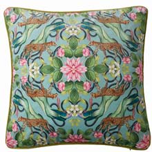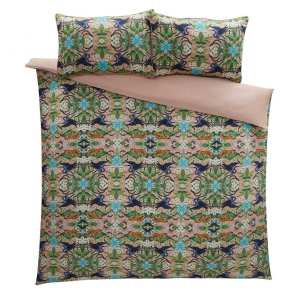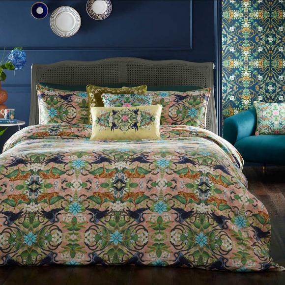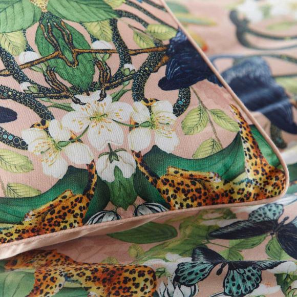 Celebrating a menagerie of the most unusual flora and fauna, butterflies, majestic inky cranes, and stalking leopards are hidden amongst unexplored kaleidoscopic patterns over a blush ground.