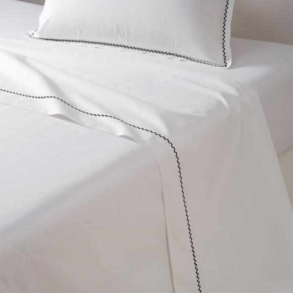 Decorated only with thin lines of checkered fancy stitch framing the bed linen, it is the angelic white cotton that is the real focus.