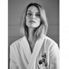 Features a shawl collar and a tone on tone belt. Made with 83% organic cotton / 17% modal, the material is fast absorbing and soft against the skin.