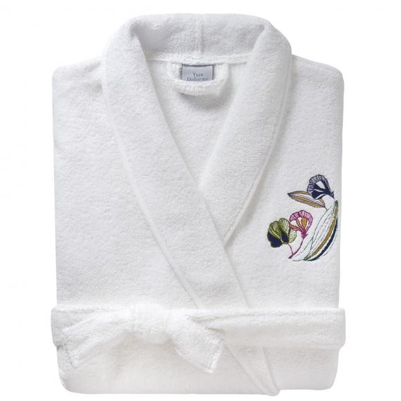 A luxurious and contemporary shawl collar bathrobe by Yves Delorme.