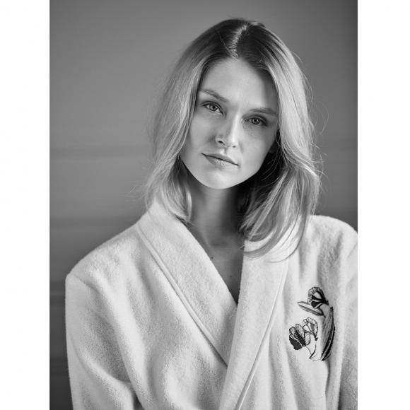 The bathrobe design features pretty flowers in powdery pastels, embroidered on the chest against a white background.