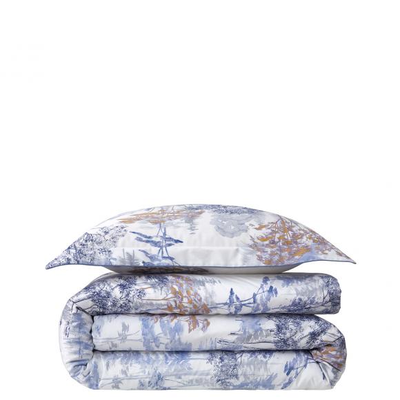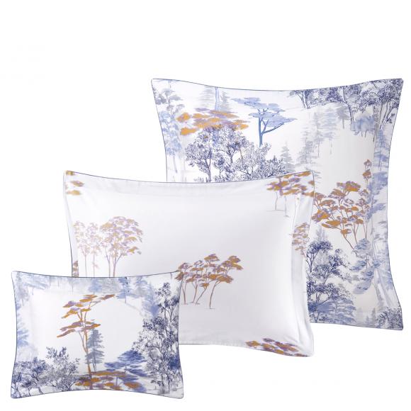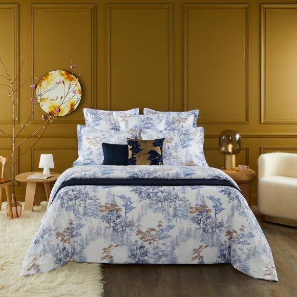 Boreale is inspired by the first frost expanding across a picture-perfect scenery of the far north, trees are drawn in blue and amber tones against a white frosty backdrop.