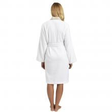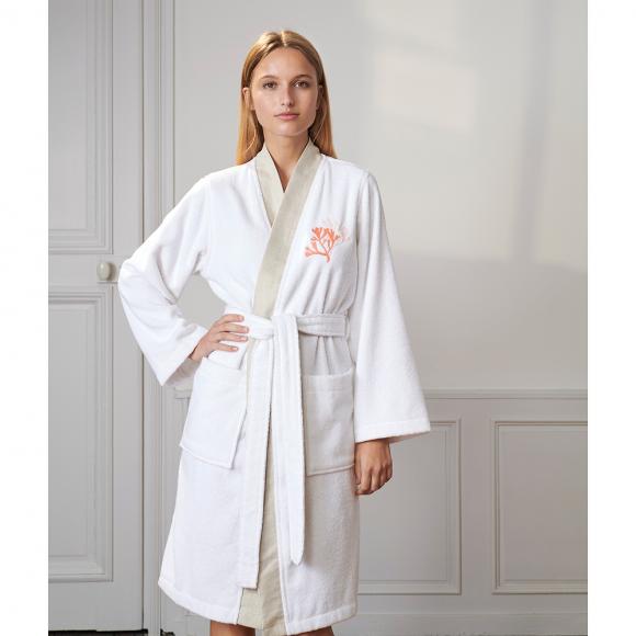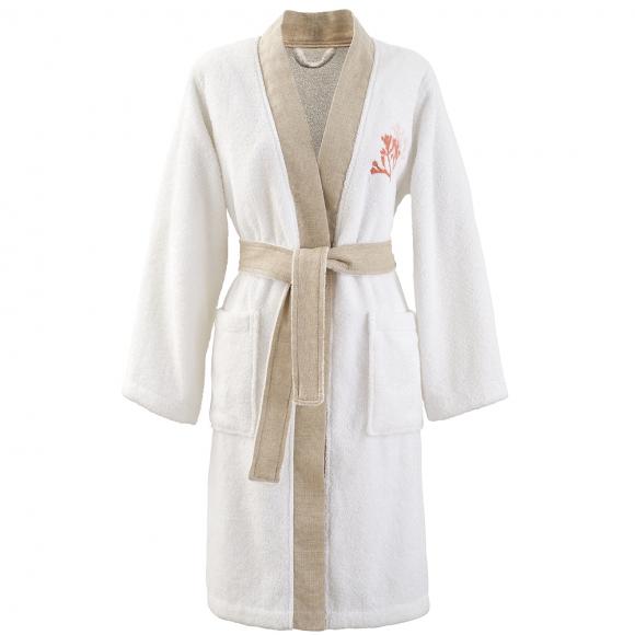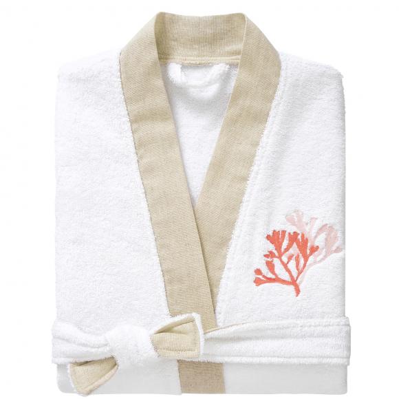 A stylish kimono in plain white with an embroidery on the chest and a beige collar. The embroidery features a coral which has been designed with a poetic style.