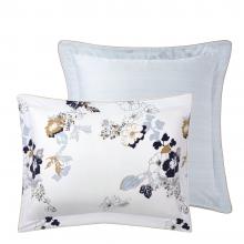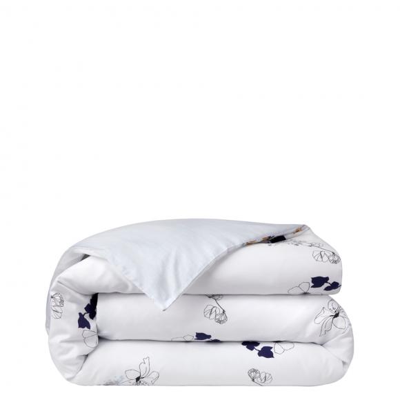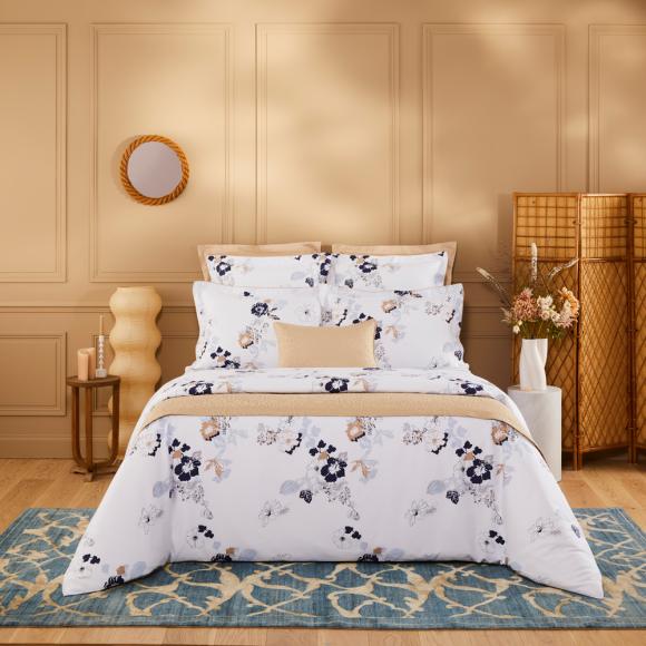 On a hidden moonlit evening, flowers carve out their silhouette on white sateen. Midnight blue, dune and sky hues from a modern poetic print.