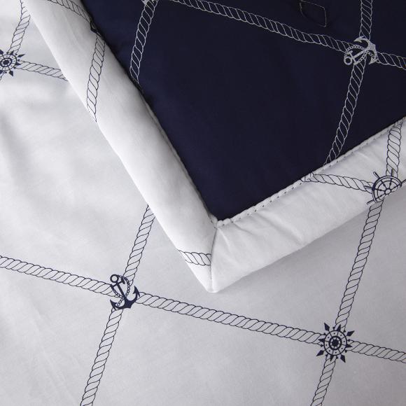 The front of the cover comes in bright white organic cotton sateen, printed with a nautical print of sailing ropes and marine symbols in ink blue.