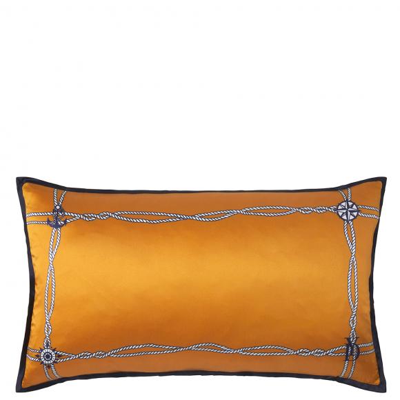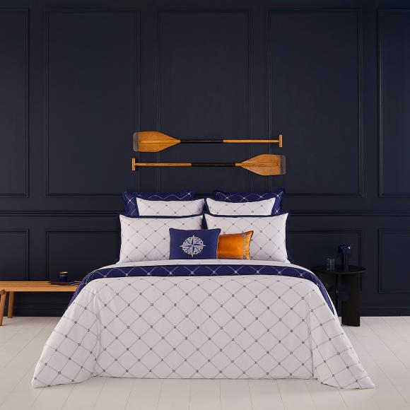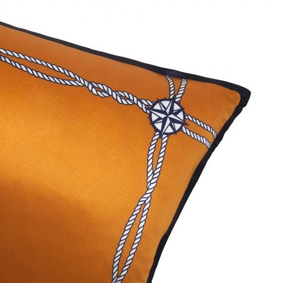 Made with pure lavish silk, the cover boasts a print of a nautical theme on both sides, featuring ropes framing the design with marine motifs and the brand logo at the crossings. The style is finished with an inserted tape finish in a contrasting navy shade.