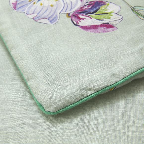 Woven from pure linen in a pastel green shade, the counterpane is padded for extra warmth and finished with a turquoise piping along the edges.