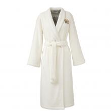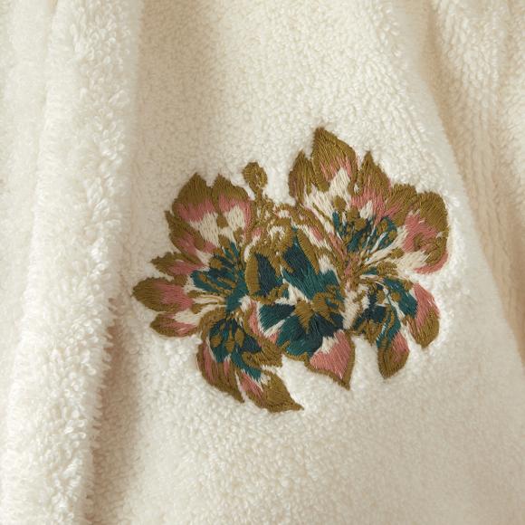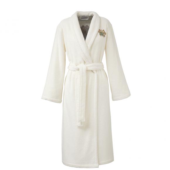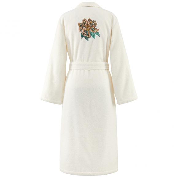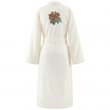 This bathrobe has a shawl collar, two large pockets and matching tie waist belt complete with floral motif on the front chest and on the back of the robe.