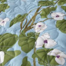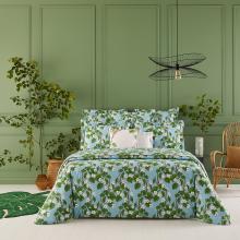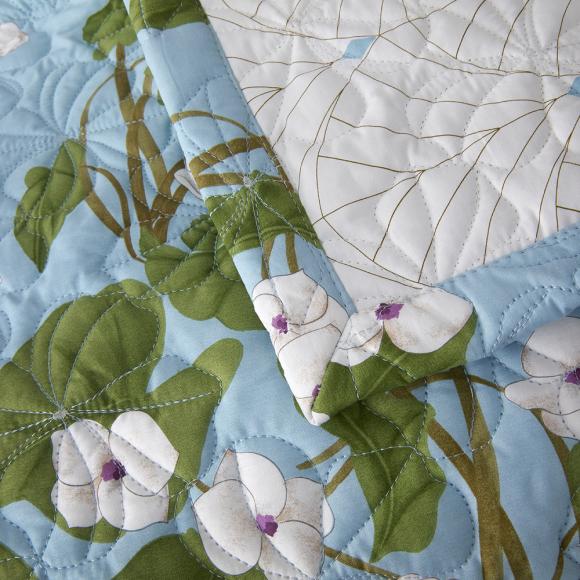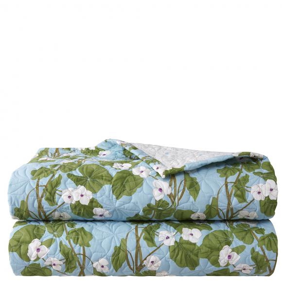 Summer spirit translated into a bedcover. Crisp yet smooth organic cotton percale is printed with an illustrated floral pattern of vines with bright green leaves, dotted with white blossoming blooms, shadowed by the cover's floral quilting.