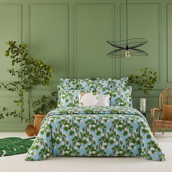 Nature is given free rein on Yves Delorme's Hanae bed linen collection. The range is covered in a beautiful illustrated overgrowth of vines with bright green leaves and blossoming white flowers set against a sky blue background.