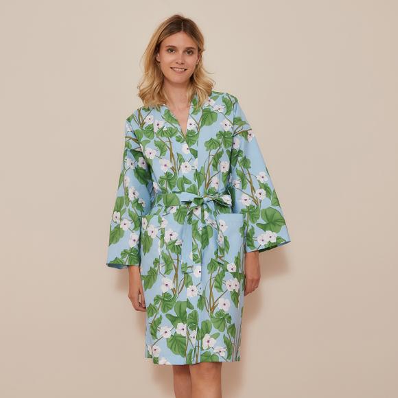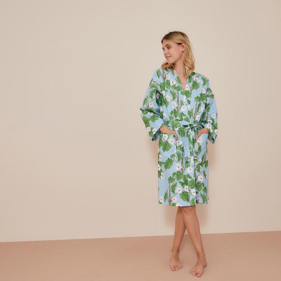 The kimono style in a sky blue shade hits just above the knees and is covered in an illustrated print of a beautiful overgrowth, featuring vines with green leaves and white blooms.